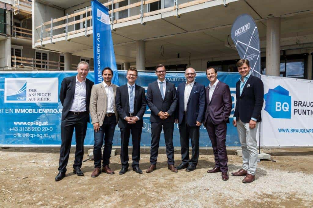 Foto (v.l.nr.) Jörg Waldauer (Raiffeisen-Landesbank Steiermark), Markus Lampesberger (IMMOLA, Projektentwicklung/Bauträger), Georg Puntigam (Baufirma, ÖSTU-STETTIN, ARGE Brauquartier Puntigam), Helmuth Scheuch (Bezirksvorsteher Puntigam), Franz Gschiegl (zukünftiger Eigentümer, ERSTE Immobilien KAG), Peter Karl (zukünftiger Eigentümer, ERSTE Immobilien KAG), Thomas Schober-Plankl (C&P, Projektentwicklung/Bauträger)