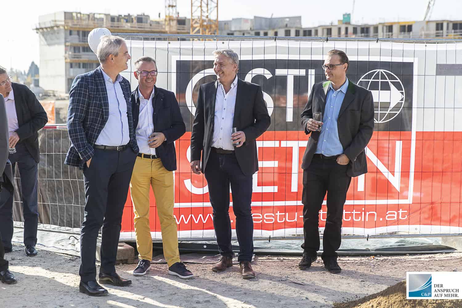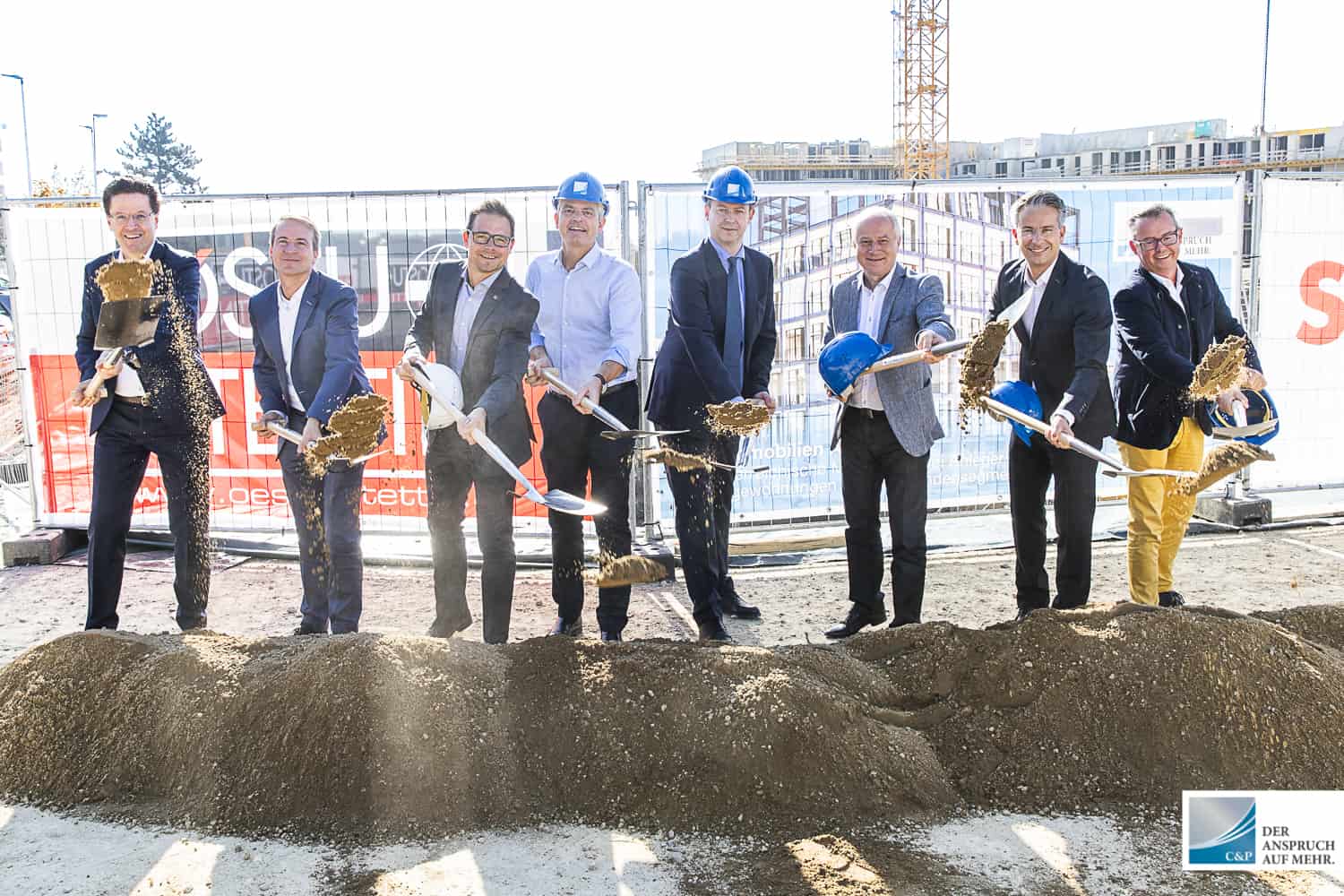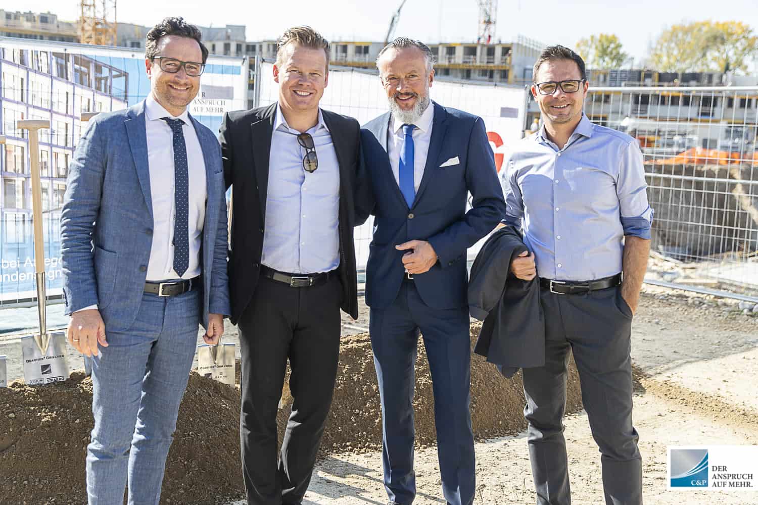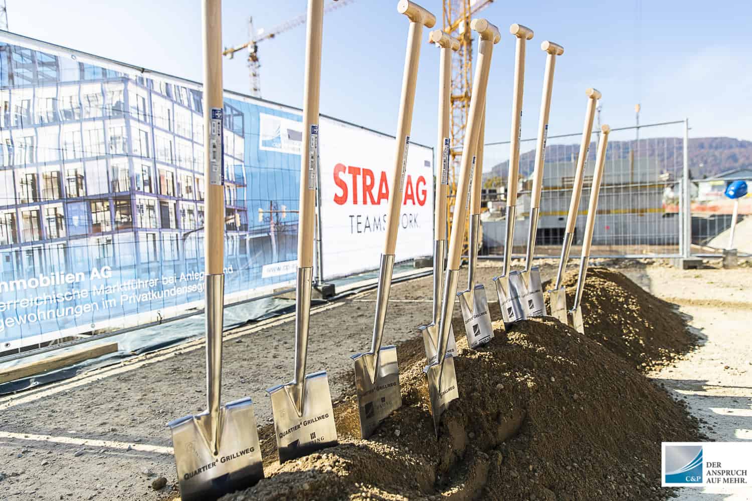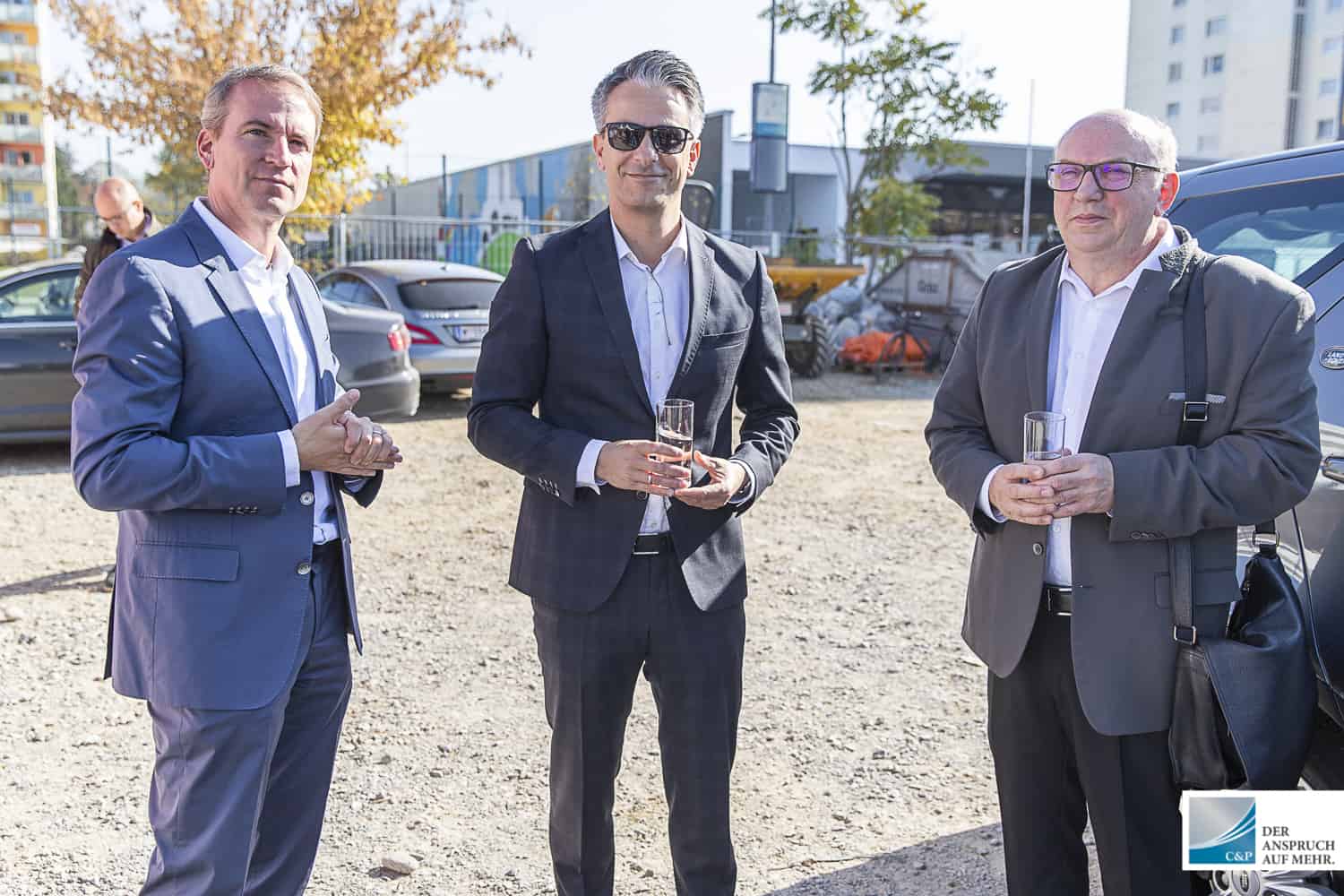 Der Leiter der Projektentwicklung Steiermark & Kärnten DI Edgar Rami, setzte gemeinsam mit Georg Puntigam, Hellfried Gugel, Hans Seitinger, Kurt Hohensinner sowie Ronald Mandl die Spaten für rund 700 Anleger-, Eigentums- und Mietwohnungen.